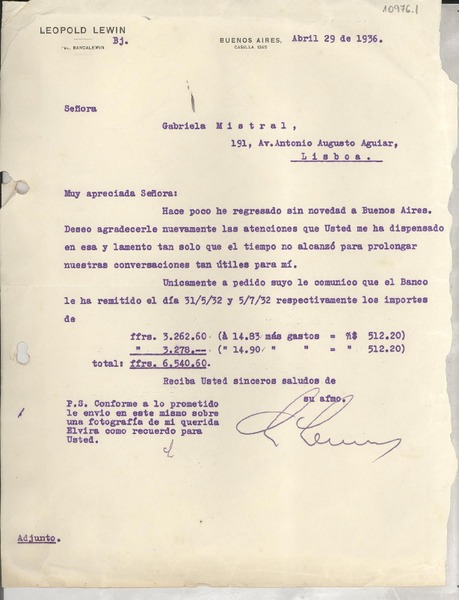 [Carta] 1936 abr. 29, Buenos Aires, [Argentina] [a] Gabriela Mistral, Lisboa, [Portugal] [manuscrito] Leopold Lewin.