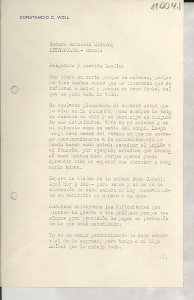 [Carta] 1942 mayo 30, Buenos Aires, [Argentina] [a] Gabriela Mistral, Petrópolis, Brasil [manuscrito] Constancio C. Vigil.