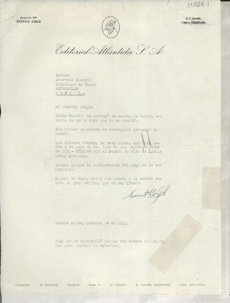 [Carta] 1943 oct. 1, Buenos Aires, [Argentina] [a] Gabriela Mistral, Consulado de Chile, Petrópolis, Brasil [manuscrito] Constancio C. Vigil.
