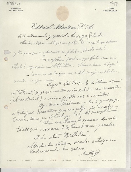 [Carta] 1941 oct. 17, Buenos Aires, [Argentina] [a] Gabriela Mistral [manuscrito] Constancio C. Vigil.