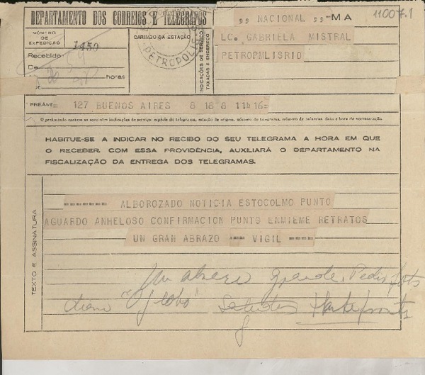 [Telegrama] [1945], Buenos Aires, [Argentina] [a] Gabriela Mistral, Petrópolis, [Brasil] [manuscrito] [Constancio C.] Vigil.