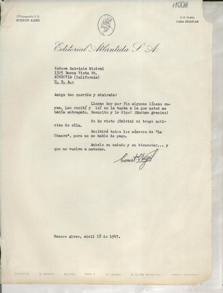 [Carta] 1947 abr. 18, Buenos Aires, [Argentina] [a] Gabriela Mistral, Monrovia, California, [EE.UU.] [manuscrito] Constancio C. Vigil.