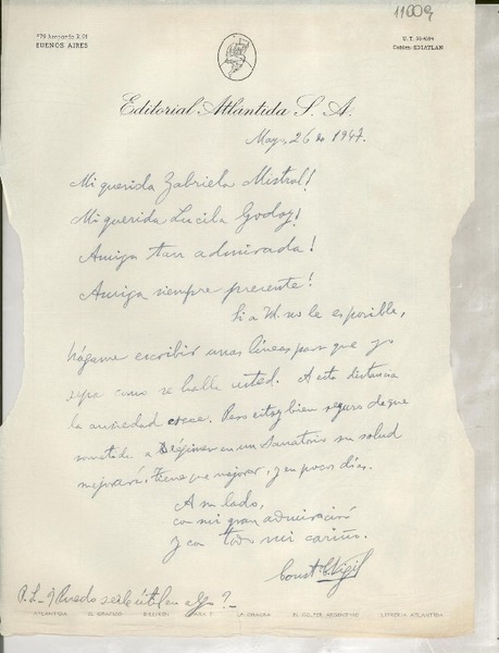 [Carta] 1947 mayo 26, Buenos Aires, [Argentina] [a] Gabriela Mistral [manuscrito] Constancio C. Vigil.