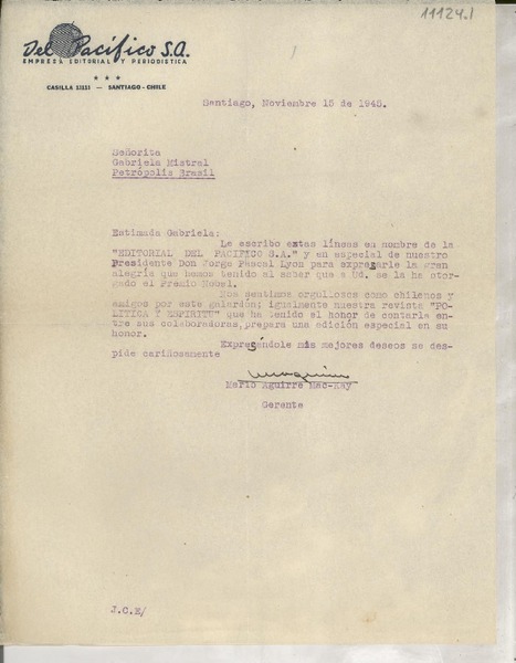 [Carta] 1945 nov. 15, Santiago, [Chile] [a] Gabriela Mistral, Petrópolis, Brasil [manuscrito] Mario Aguirre Mac-Kay.
