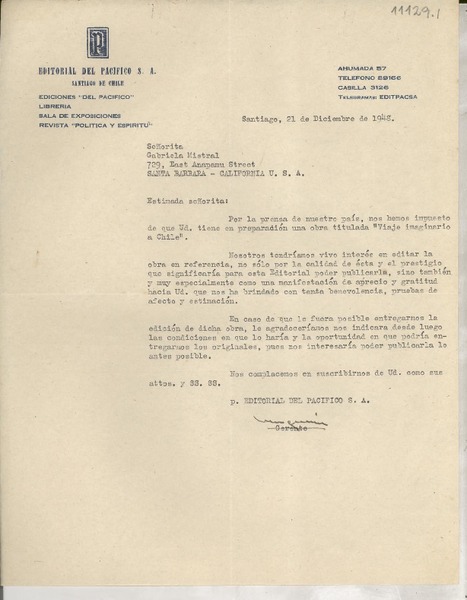 [Carta] 1948 dic. 21, Santiago, [Chile] [a] Gabriela Mistral, Santa Barbara, California, [EE.UU.] [manuscrito] Mario Aguirre Mac-Kay.