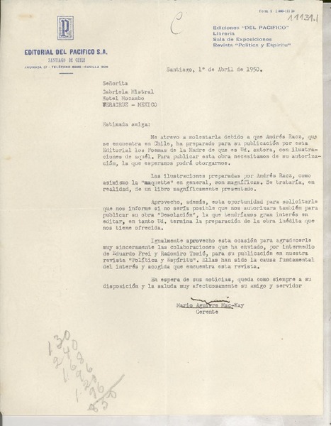 [Carta] 1950 abr. 1, Santiago, [Chile] [a] Gabriela Mistral, Hotel Mocambo, Veracruz, México [manuscrito] Mario Aguirre Mac-Kay.