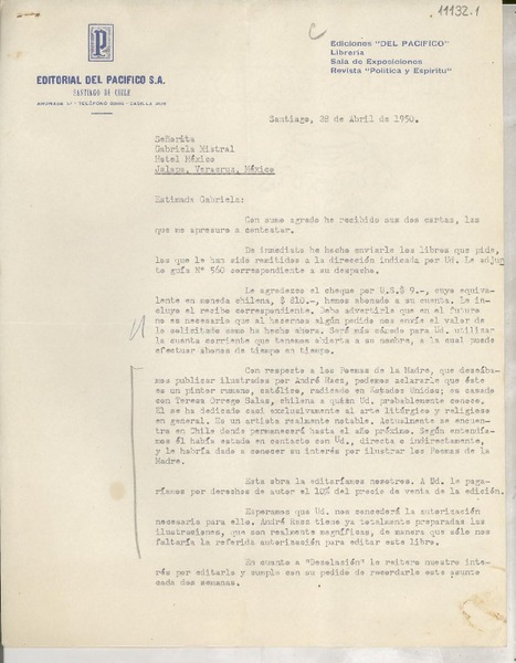 [Carta] 1950 abr. 28, Santiago, [Chile] [a] Gabriela Mistral, Hotel México, Jalapa, Veracruz, México [manuscrito] Mario Aguirre Mac-Kay.