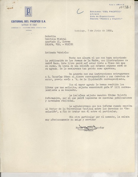 [Carta] 1950 jun. 7, Santiago, Chile [a] Gabriela Mistral, Xalapa, Ver[acruz], México [manuscrito] Mario Aguirre Mac-Kay.
