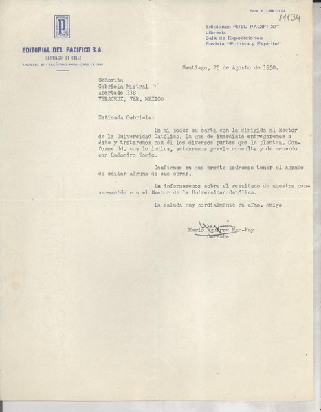 [Carta] 1950 ago. 25, Santiago, [Chile] [a] Gabriela Mistral, Veracruz, México [manuscrito] Mario Aguirre Mac-Kay.