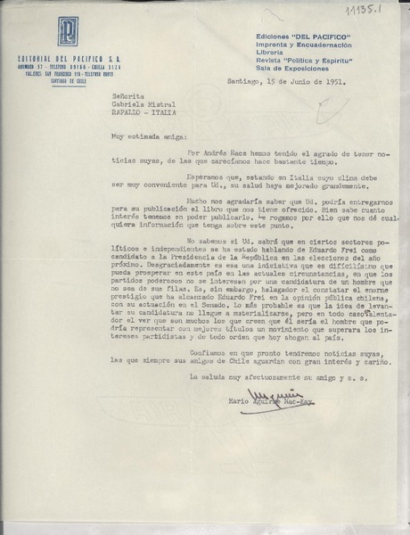 [Carta] 1951 jun. 15, Santiago, [Chile] [a] Gabriela Mistral, Rapallo, Italia [manuscrito] Mario Aguirre Mac-Kay.