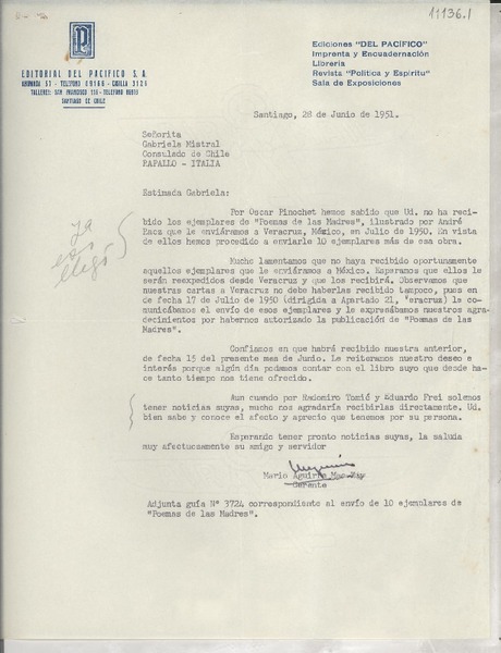 [Carta] 1951 jun. 28, Santiago, [Chile] [a] Gabriela Mistral, Consulado de Chile, Rapallo, Italia [manuscrito] Mario Aguirre Mac-Kay.