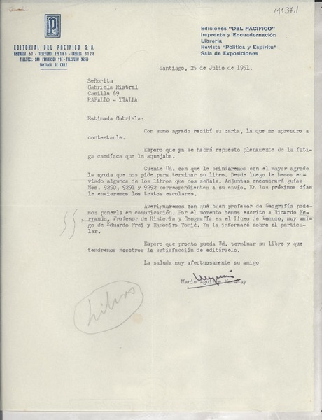 [Carta] 1951 jul. 25, Santiago, [Chile] [a] Gabriela Mistral, Rapallo, Italia [manuscrito] Mario Aguirre Mac-Kay.