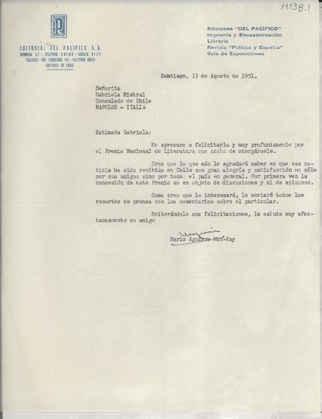 [Carta] 1951 ago. 13, Santiago, [Chile] [a] Gabriela Mistral, Consulado de Chile, Nápoles, Italia [manuscrito] Mario Aguirre Mac-Kay.