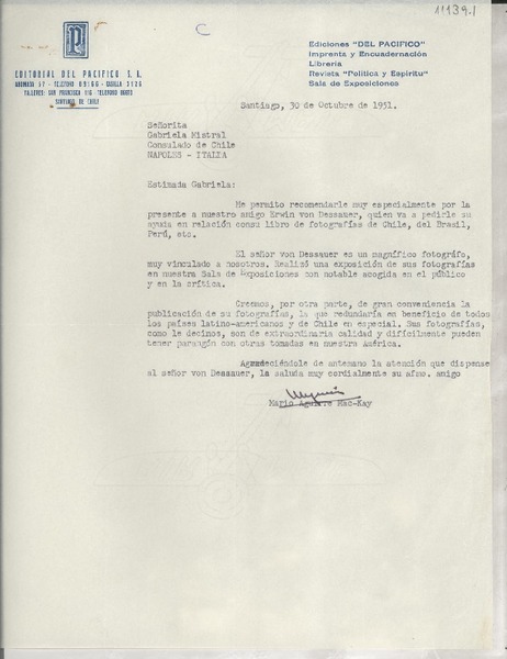 [Carta] 1951 oct. 30, Santiago, [Chile] [a] Gabriela Mistral, Consulado de Chile, Nápoles, Italia [manuscrito] Mario Aguirre Mac-Kay.
