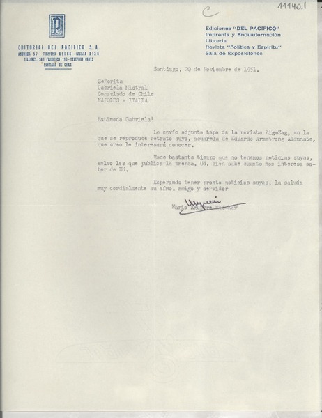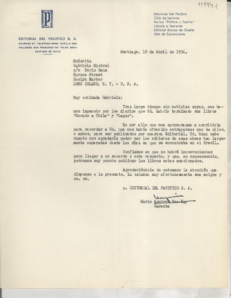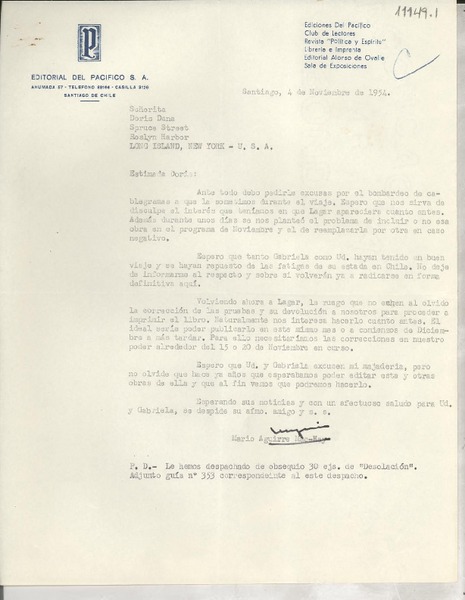 [Carta] 1954 Nov. 18, [EE.UU.] [a] Mario Aguirre Mac-Kay, Editorial del Pacífico S.A., Santiago, Chile [manuscrito] Doris Dana.