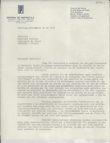 [Carta] 1952 nov. 20, Santiago, [Chile] [a] Gabriela Mistral, Consulado de Chile, Nápoles, Italia [manuscrito] Mario Aguirre Mac-Kay.