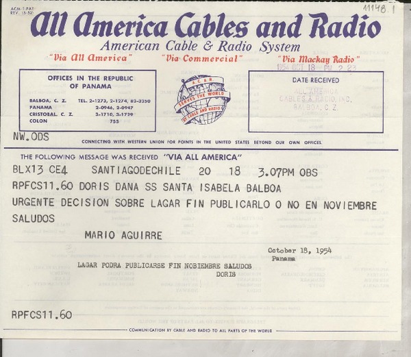[Carta] 1954 nov. 4, Santiago, [Chile] [a] Doris Dana, Roslyn Harbor, Long Island, N. Y., EE.UU. [manuscrito] Mario Aguirre Mac-Kay.