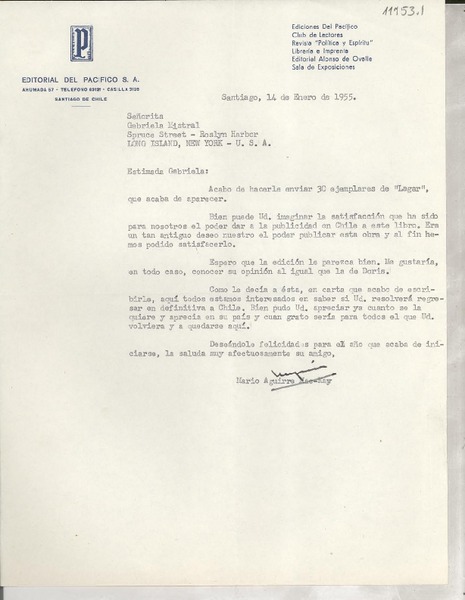 [Carta] 1955 ene. 14, Santiago, [Chile] [a] Gabriela Mistral, Roslyn Harbor, Long Island, N. Y., EE.UU. [manuscrito] Mario Aguirre Mac-Kay.