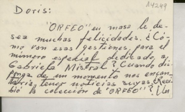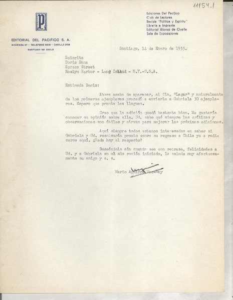 [Carta] 1955 ene. 14, Santiago, [Chile] [a] Doris Dana, Roslyn Harbor, Long Island, N. Y., EE.UU. [manuscrito] Mario Aguirre Mac-Kay.