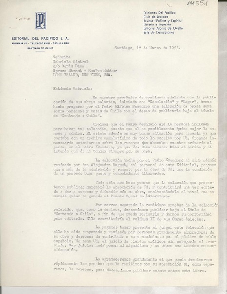 [Carta] 1955 mar. 1, Santiago, [Chile] [a] Doris Dana, Roslyn Harbor, Long Island, New York, EE.UU. [manuscrito] Mario Aguirre Mac-Kay.