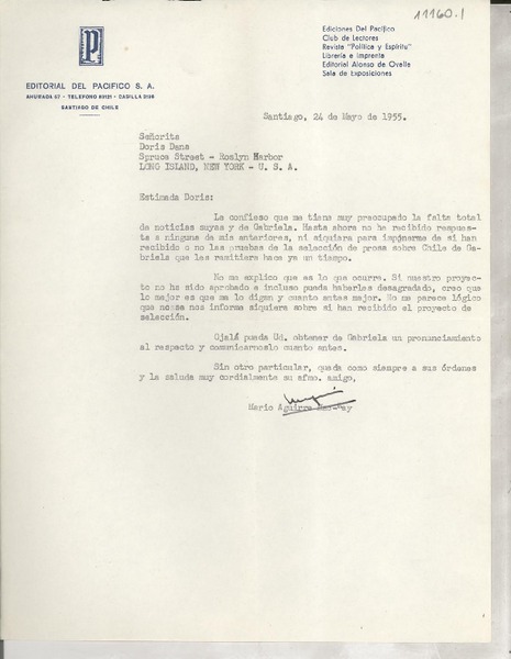 [Carta] 1955 mayo 24, Santiago, [Chile] [a] Doris Dana, Roslyn Harbor, Long Island, New York, EE.UU. [manuscrito] Mario Aguirre Mac-Kay.
