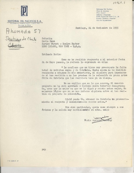 [Carta] 1955 nov. 24, Santiago, [Chile] [a] Doris Dana, Roslyn Harbor, Long Island, N. Y., EE.UU. [manuscrito] Mario Aguirre Mac-Kay.