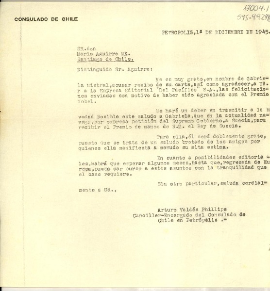 [Carta] 1945 dic. 1, Petrópolis, [Brasil] [a] Mario Aguirre MK., Santiago de Chile [manuscrito] Arturo Valdés Phillips.