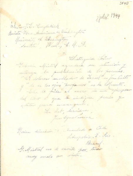 Englekirk, John Eugene - Mistral, Gabriela - Correspondencia