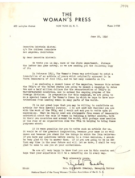 [Carta] 1946 jun. 20, N. York [a] Gabriela Mistral, Los Angeles, California [manuscrito] Elizabeth Bradley.