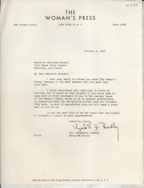 [Carta] 1946 Oct. 9, New York, [EE.UU.] [a] Gabriela Mistral, Monrovia, California, [EE.UU.] [manuscrito] Elizabeth Bradley.