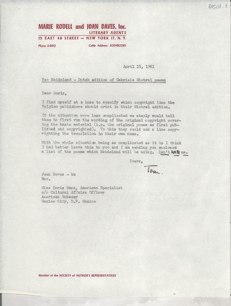 [Carta] 1961 Apr. 18, [New York, Estados Unidos] [a] Miss Doris Dana, American Specialist, American Embassy, Mexico City, D. F. Mexico [manuscrito] Joan Daves.