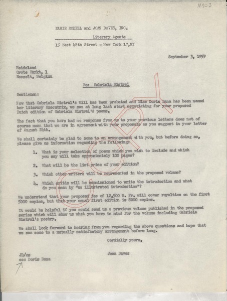 [Carta] 1959 Sept. 3, New York, [EE.UU.] [a] Heideland, Hasselt, Belgium [manuscrito] Joan Daves.
