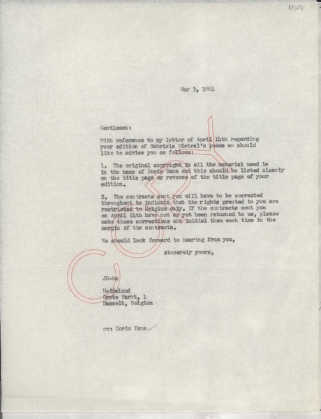 [Carta] 1961 may 3, [New York, Estados Unidos] [a] Bernard B. Perry, con copia a Doris Dana, Bloomingston, Indiana, [Estados Unidos] [manuscrito] [Joan Daves].