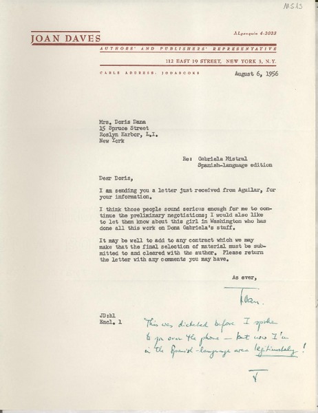 [Carta] 1956 Aug. 6, New York, [EE.UU.] [a] Mrs. Doris Dana, Roslyn Harbor, L. I., New York, [EE.UU.] [manuscrito] Joan [Daves].