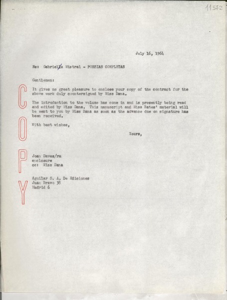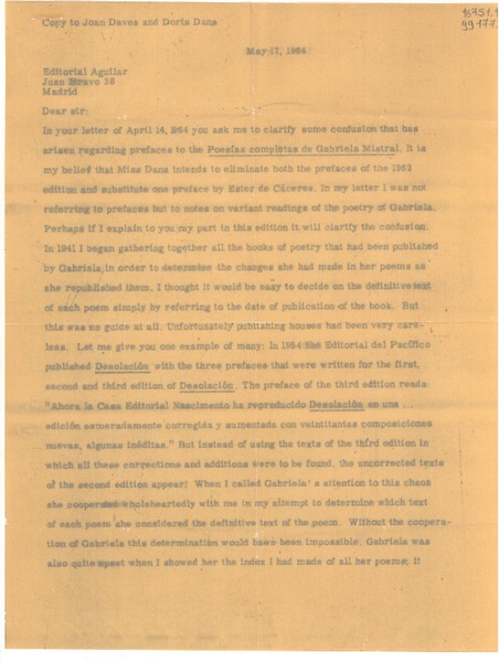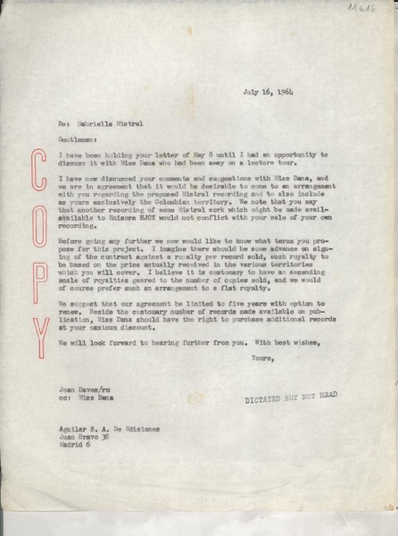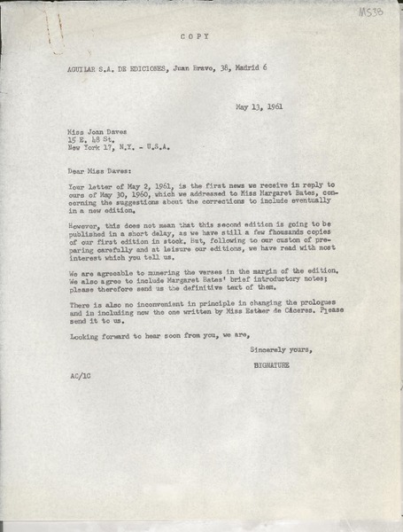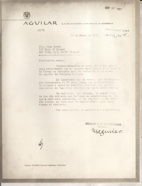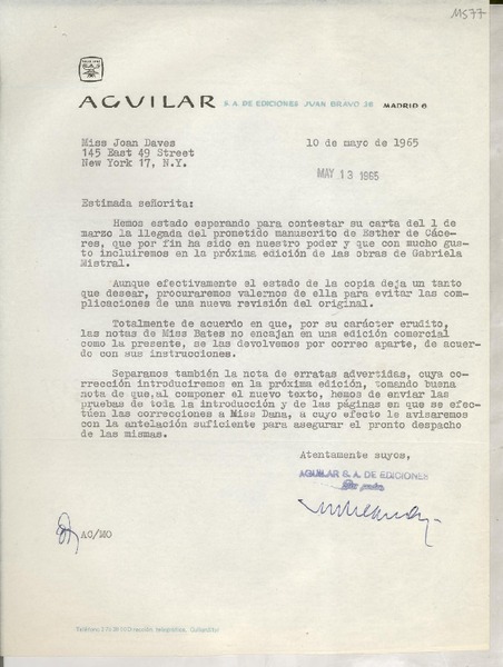 [Carta] 1961 may 13, Madrid, [Spain] [a] Miss Joan Daves, New York, EE.UU. [manuscrito] Aguilar S. A. de Ediciones.