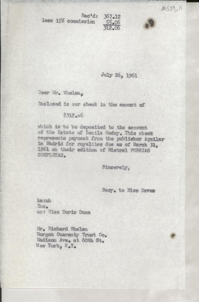 [Carta] 1961 July 26, [EE.UU.] [a] Mr. Richard Whelan, Morgan Guaranty Trust Co., New York, [EE.UU.] [manuscrito] Joan Daves.