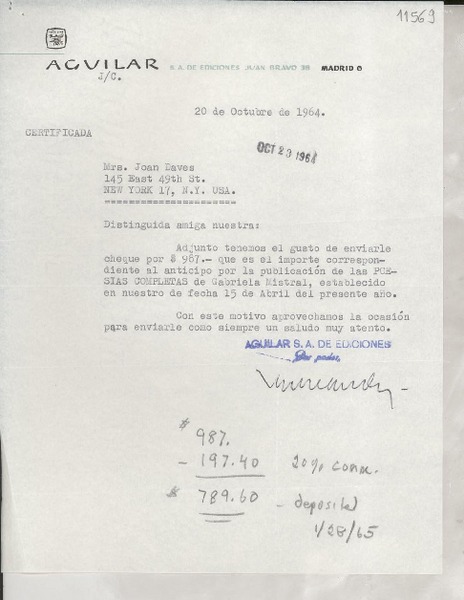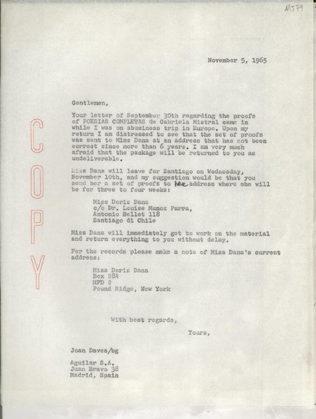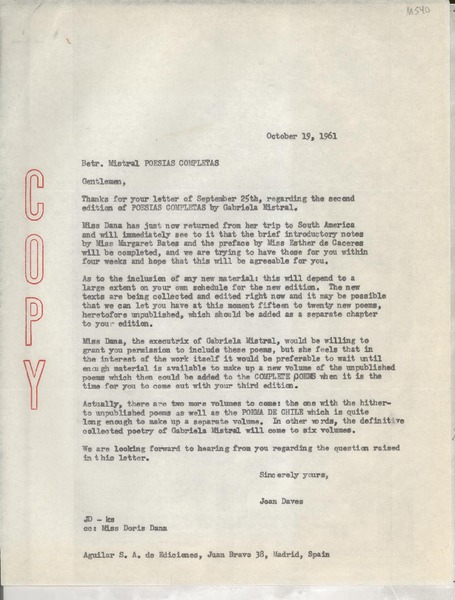 [Carta] 1961 Oct. 19, [EE.UU.] [a] Aguilar S. A. de Ediciones, Madrid, Spain [manuscrito] Joan Daves.