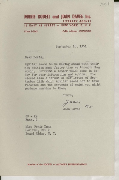 [Carta] 1961 Sept. 28, New York, [EE.UU.] [a] Doris Dana, Pound Ridge, N.Y., [EE.UU.] [manuscrito] Joan Daves.