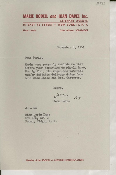 [Carta] 1961 Nov. 8, New York, [EE.UU.] [a] Miss Doris Dana, Pound, Ridge, N.Y., [EE.UU.] [manuscrito] Joan Daves.