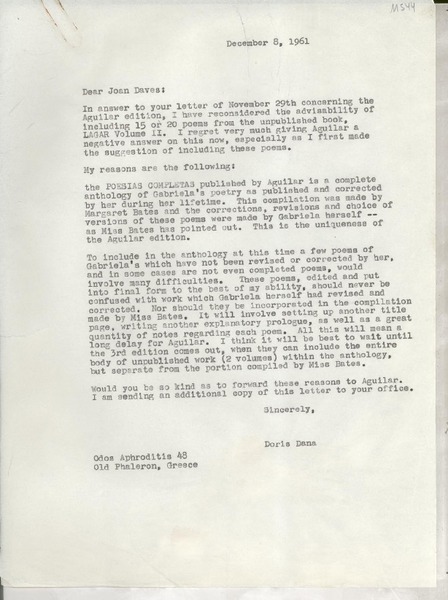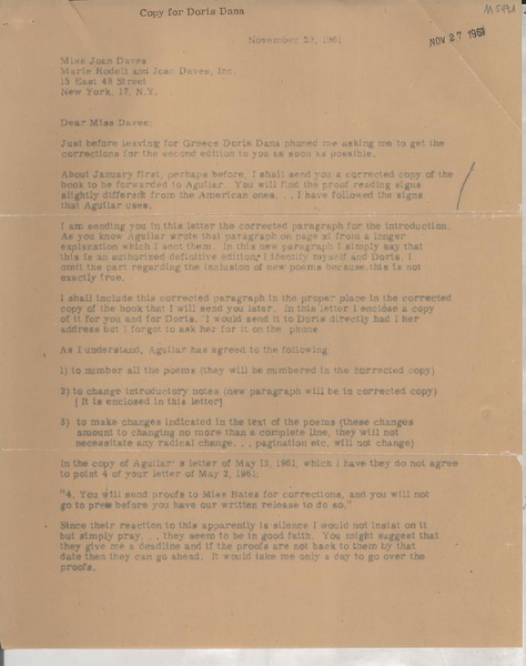 [Carta] 1961 Nov. 29, New York, [EE.UU.] [a] Doris Dana, Old Phaleron, Greece [manuscrito] Joan Daves.