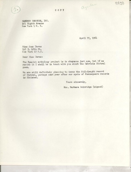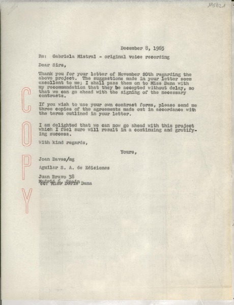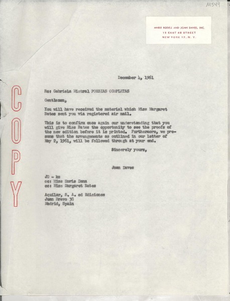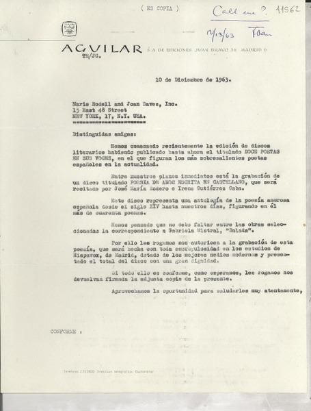 [Carta] 1961 Dec. 4, New York, [EE.UU.] [a] Aguilar, S. A. de ed Ediciones, Madrid, Spain [manuscrito] Joan Daves.