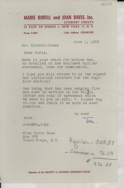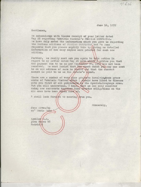 [Carta] 1972 June 16, [Estados Unidos] [a] Aguilar S. A., Juan Bravo 38, Madrid [manuscrito] Joan Daves.