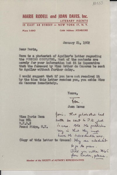 [Carta] 515 Madison Avenue, New York, N. Y. 10022, Plaza 9-6250, [EE.UU.] [a] Doris Dana, [EE.UU.] [manuscrito] [Joan Daves].