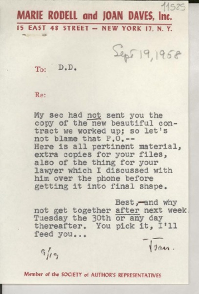 [Carta] 1958 Sept. 19, [New York, Estados Unidos] [a] D. D. [manuscrito] Joan Daves.