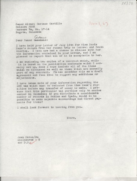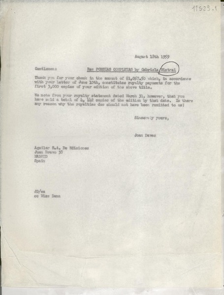 [Carta] 1959 Aug. 18, [New York, Estados Unidos] [a] Aguilar S. A. de ediciones, Juan Bravo 38, Madrid, Spain [manuscrito] Joan Daves.