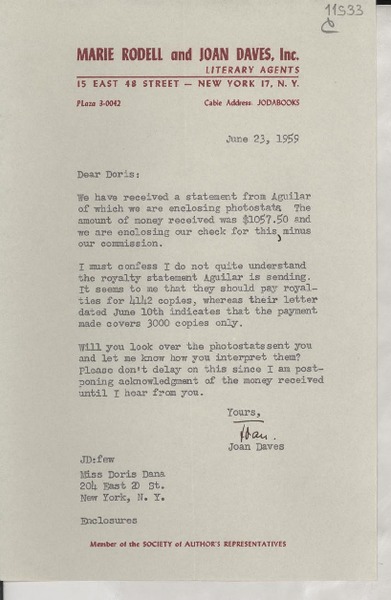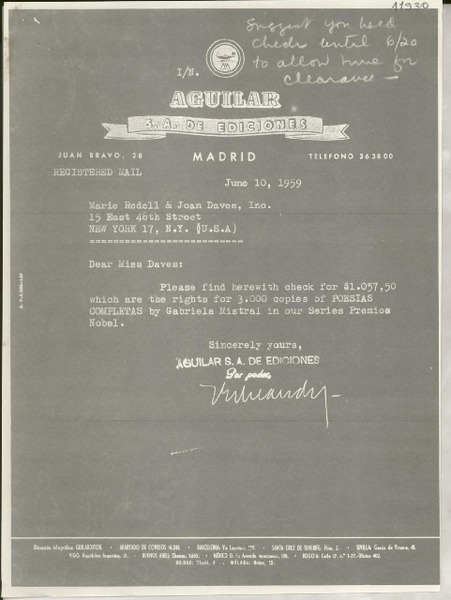 [Carta] 1959 June 10, Madrid, [España] [a] Marie Rodell & Joan Daves, Inc., 15 East 48th Street, New York 17, N. Y. (U. S. A.), Dear Miss Daves [manuscrito] Aguilar S. A. de ediciones.