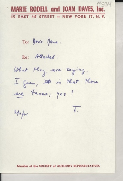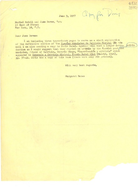 [Carta] 1957 June 3, [Estados Unidos] [a] Marie Rodell and Joan Daves, Inc., 15 East 48 Street, New York [manuscrito] Margaret Bates.