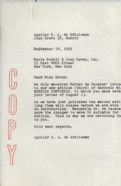 [Carta] 1958 Sept. 19, [New York, Estados Unidos] [a] Aguilar, Juan Bravo 38, Madrid, Spain [manuscrito] Joan Daves.
