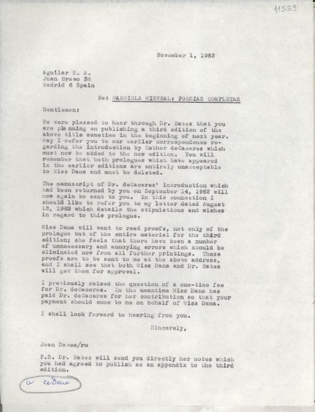 [Carta] 1961 Nov. 23, Washington, D.C., [EE.UU.] [a] Miss Joan Daves, Marie Rodell and Joan Daves, Inc., New York, [EE.UU.] [manuscrito] Margaret Bates.