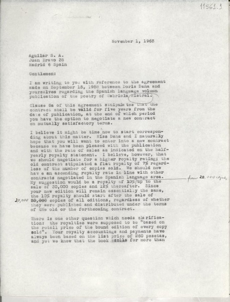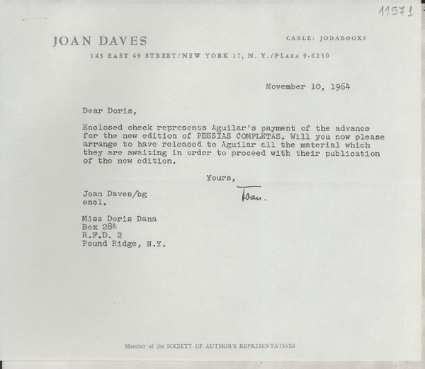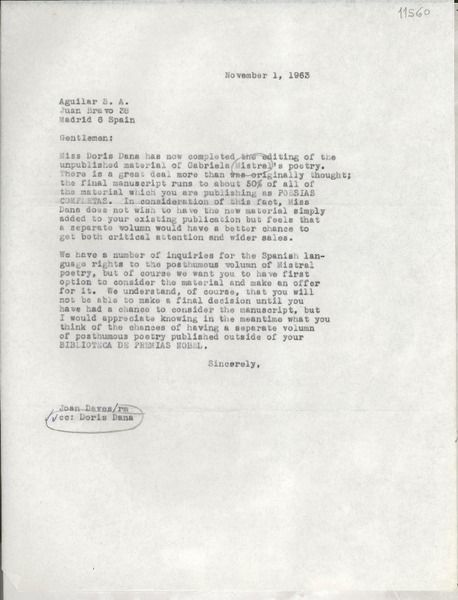 [Carta] 1961 Sept. 11, [EE.UU.] [a] Aguilar S. A. de Ediciones, Madrid, Spain [manuscrito] Joan Daves.